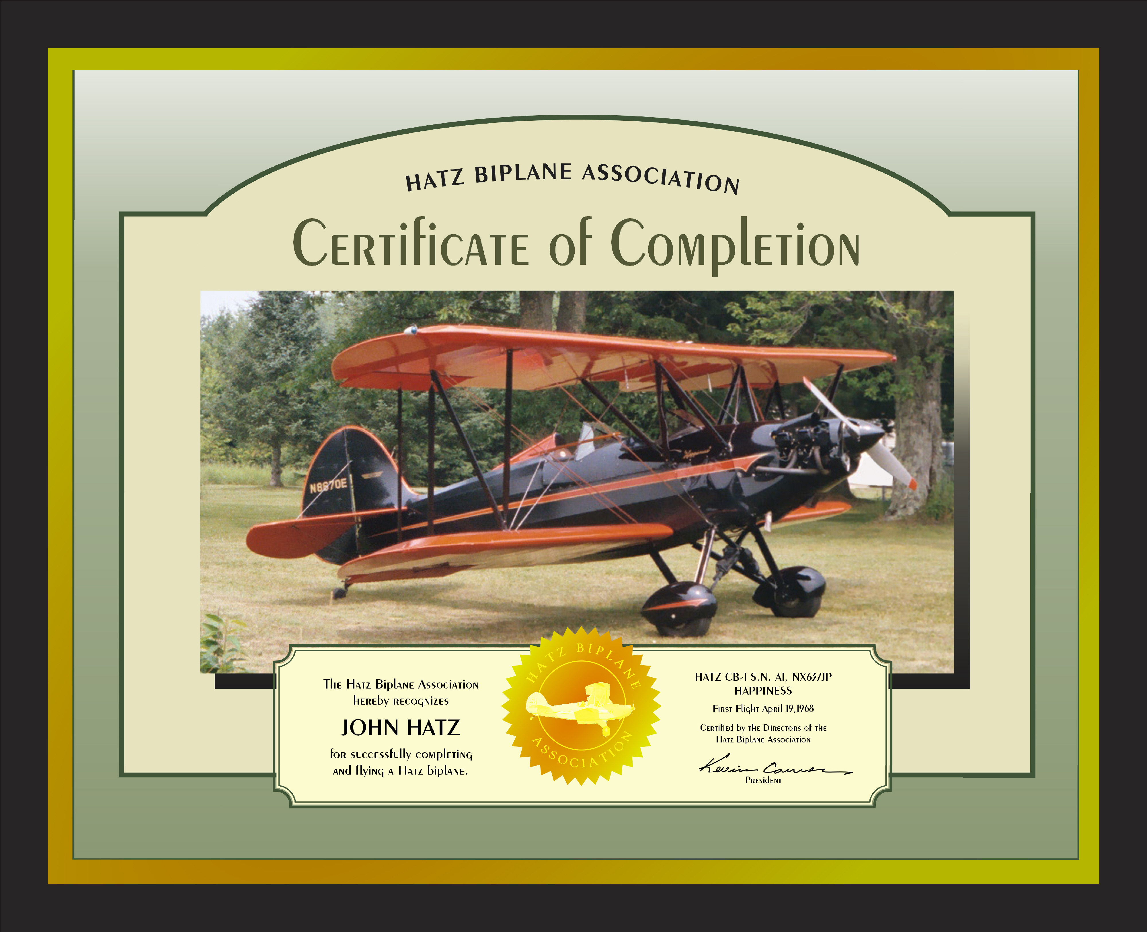 The certificate is printed on archival Aquarella art paper with a matte textured surface, similar to watercolor paper, with Vivera pigments that resist fading for over two hundred years. Framed professionally using Larson-Juhl "all wood" moldings made in Wisconsin, all the materials used are acid free for stability and long life. Signed by the current president of the Association and stamped with a gold foil seal, the certificate memorialize the tremendous achievement of building and flying your own aircraft.